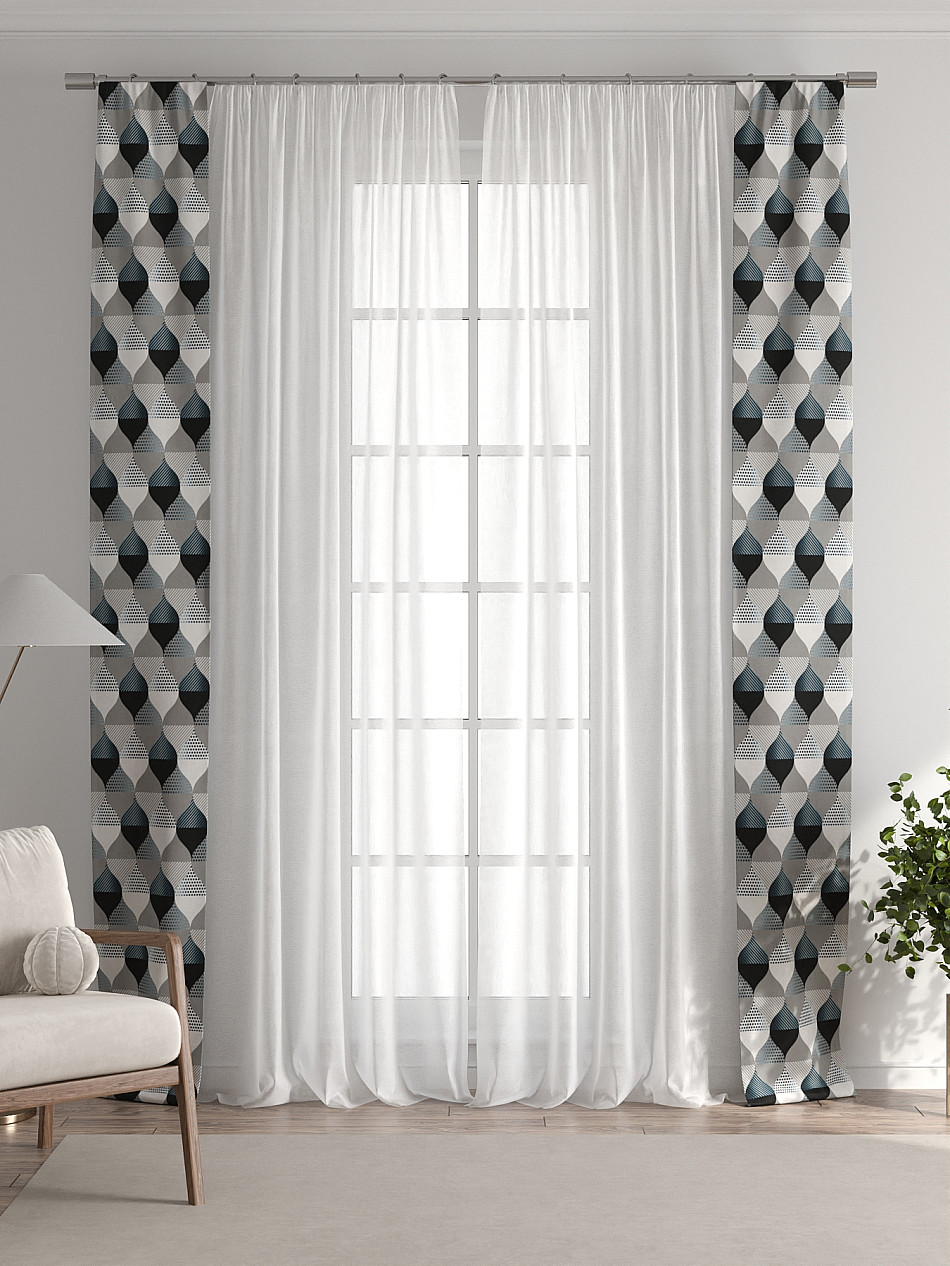 Комплект готов к развешиванию. По верхнему краю пристрочена шторная лента 6 см, с 2-мя рядами петель под крючки, что позволяет регулировать высоту. Одновременно имеется кулиска (карман для штанги), в которую можно продеть карниз любого диаметра.
