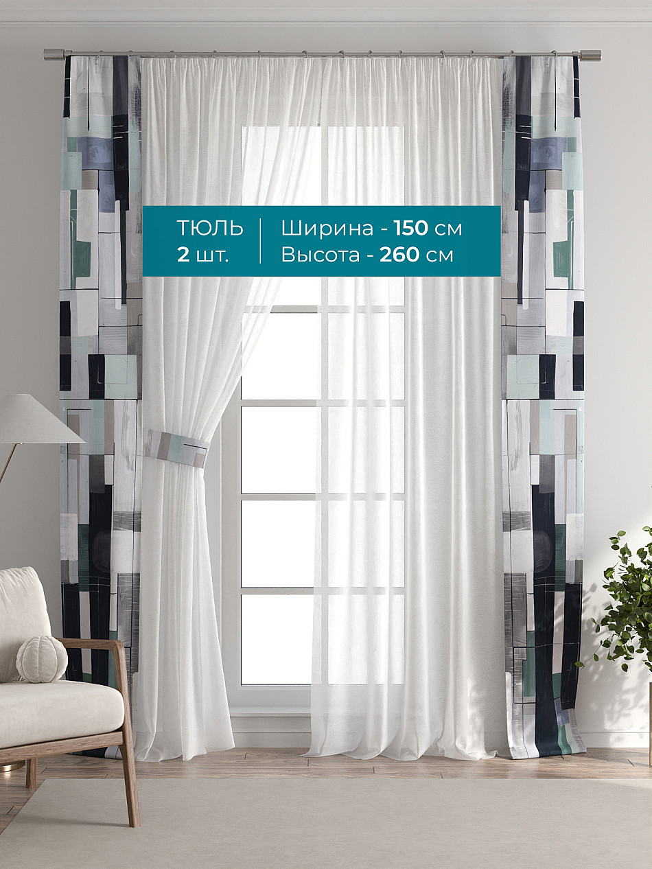 Декоративные подхваты 38х260 см — 2 шт.; Тюль 150х260 см — 2 шт. ( Изменить высоту) Крепление: шторная лента (крючки), кулиска Подробнее