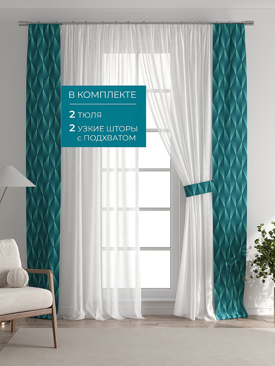 Представляем вам абсолютно новый подход к оформлению окна! Наш комплект белого тюля с узкими цветными шторами-подхватами станет идеальным решением для тех, кто любит, чтобы в комнате было светло и при этом хочет добавить цветовой акцент в интерьер комнаты.