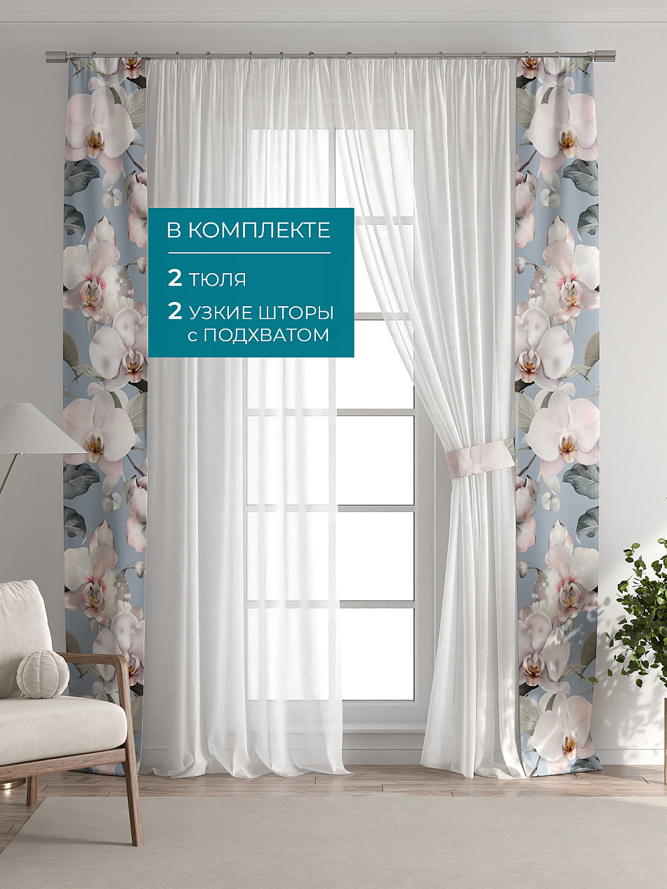 Декоративные подхваты 38х260 см — 2 шт.; Тюль 150х260 см — 2 шт. ( Изменить высоту) Крепление: шторная лента (крючки), кулиска Подробнее