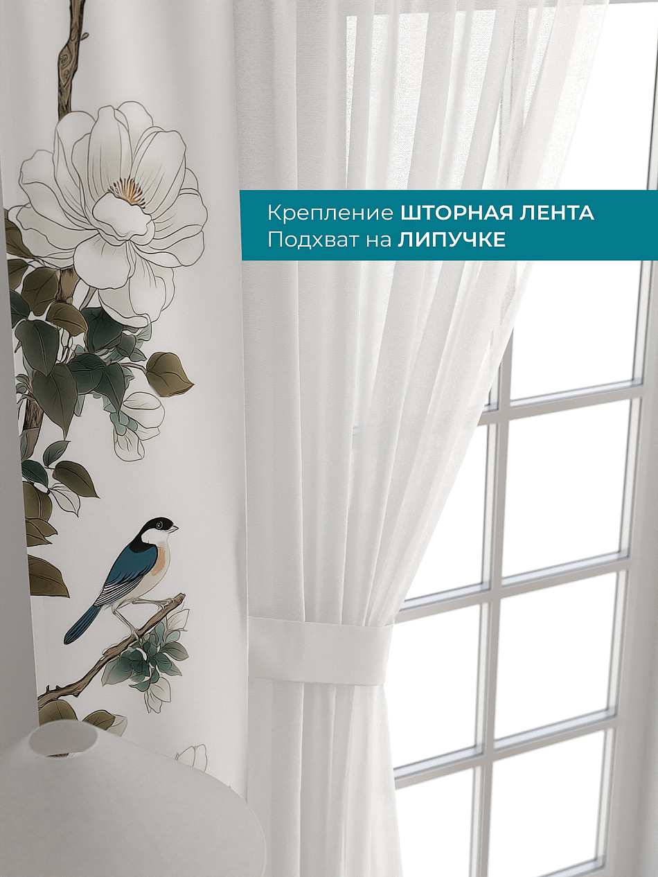 На высоте 125 см. пришит подхват (ширина 10 см.), который позволяет легко зафиксировать тюль или шторы в нужном положении при помощи липучки.