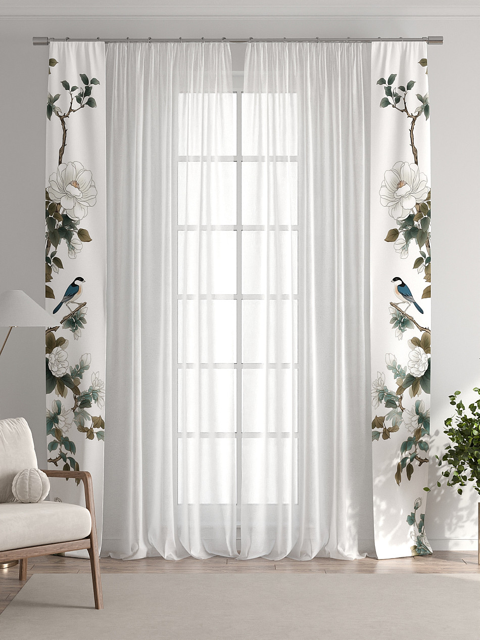 Комплект готов к развешиванию. По верхнему краю пристрочена шторная лента 6 см, с 2-мя рядами петель под крючки, что позволяет регулировать высоту. Одновременно имеется кулиска (карман для штанги), в которую можно продеть карниз любого диаметра.