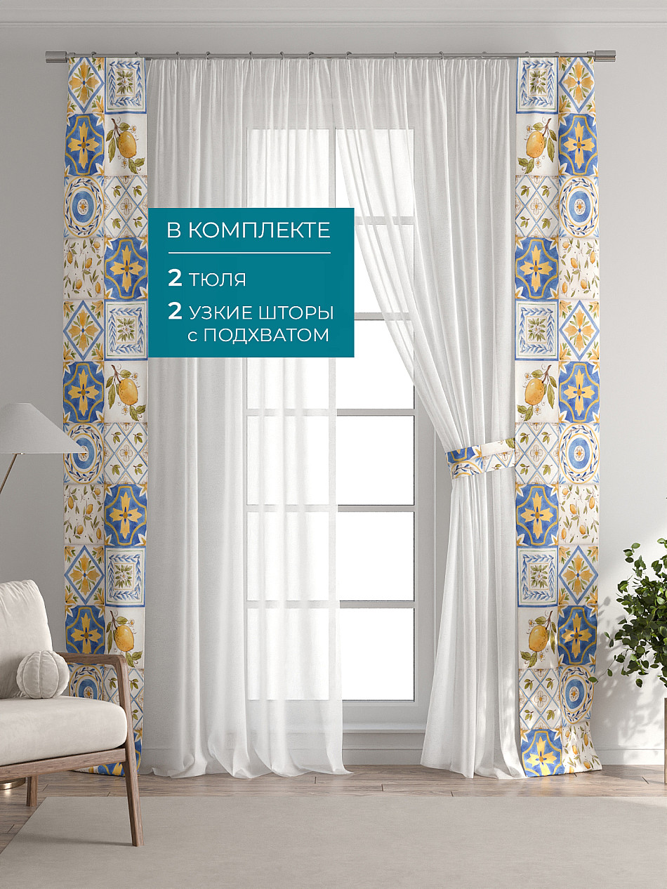 Представляем вам абсолютно новый подход к оформлению окна! Наш комплект белого тюля с узкими цветными шторами-подхватами станет идеальным решением для тех, кто любит, чтобы в комнате было светло и при этом хочет добавить цветовой акцент в интерьер комнаты.
