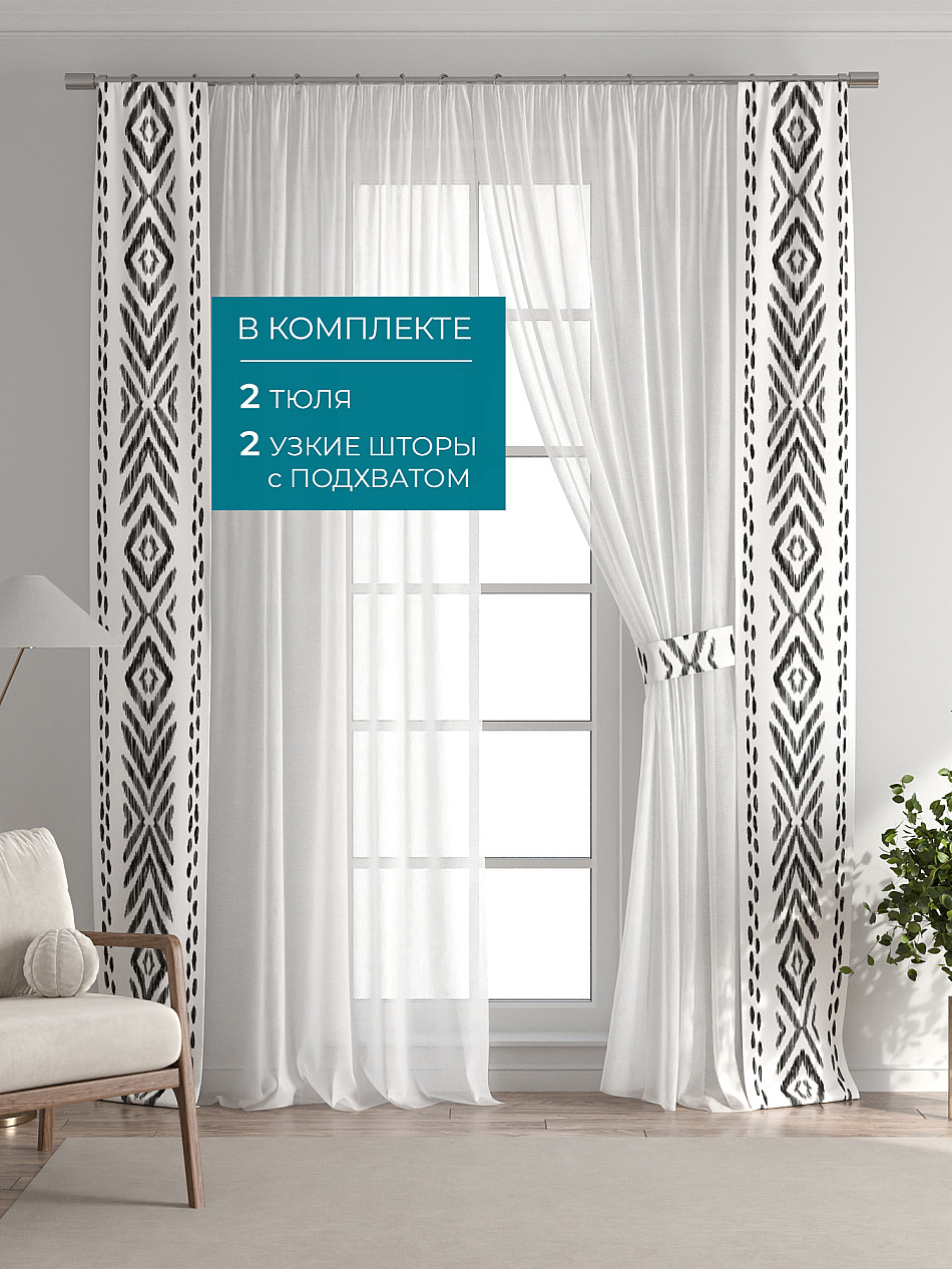В комплект входят: - 2 полотна белого тюля шириной 150 см.. и высотой 260 см и - 2 узкие шторы шириной всего 38 см. и длиной 260 см., которые навешиваются рядом с тюлем не утяжеляя вид окна и не препятствуя попаданию солнечного света в комнату. При этом выполняют роль подхватов и добавляют акцент в интерьер.
