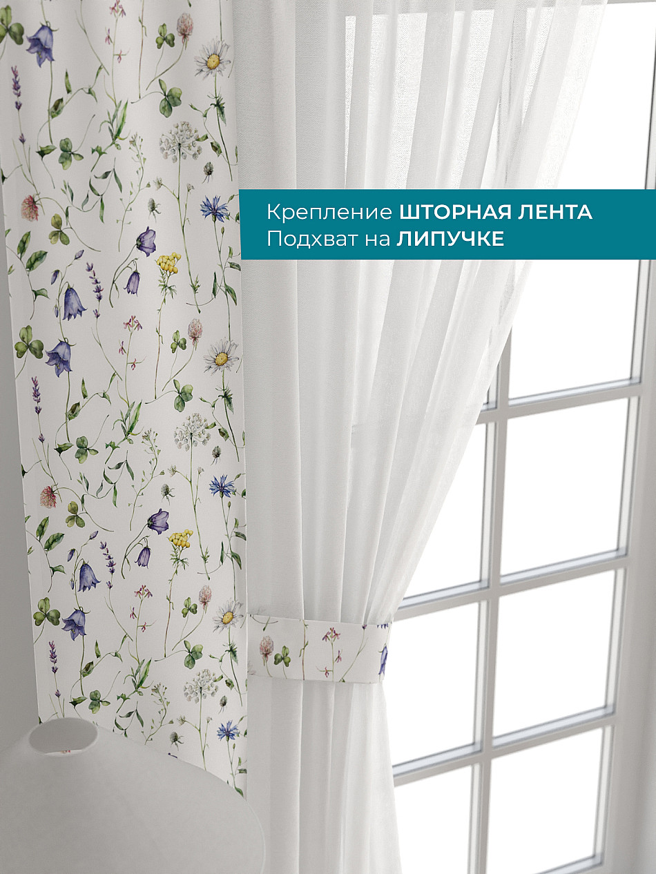 На высоте 125 см. пришит подхват (ширина 10 см.), который позволяет легко зафиксировать тюль или шторы в нужном положении при помощи липучки.