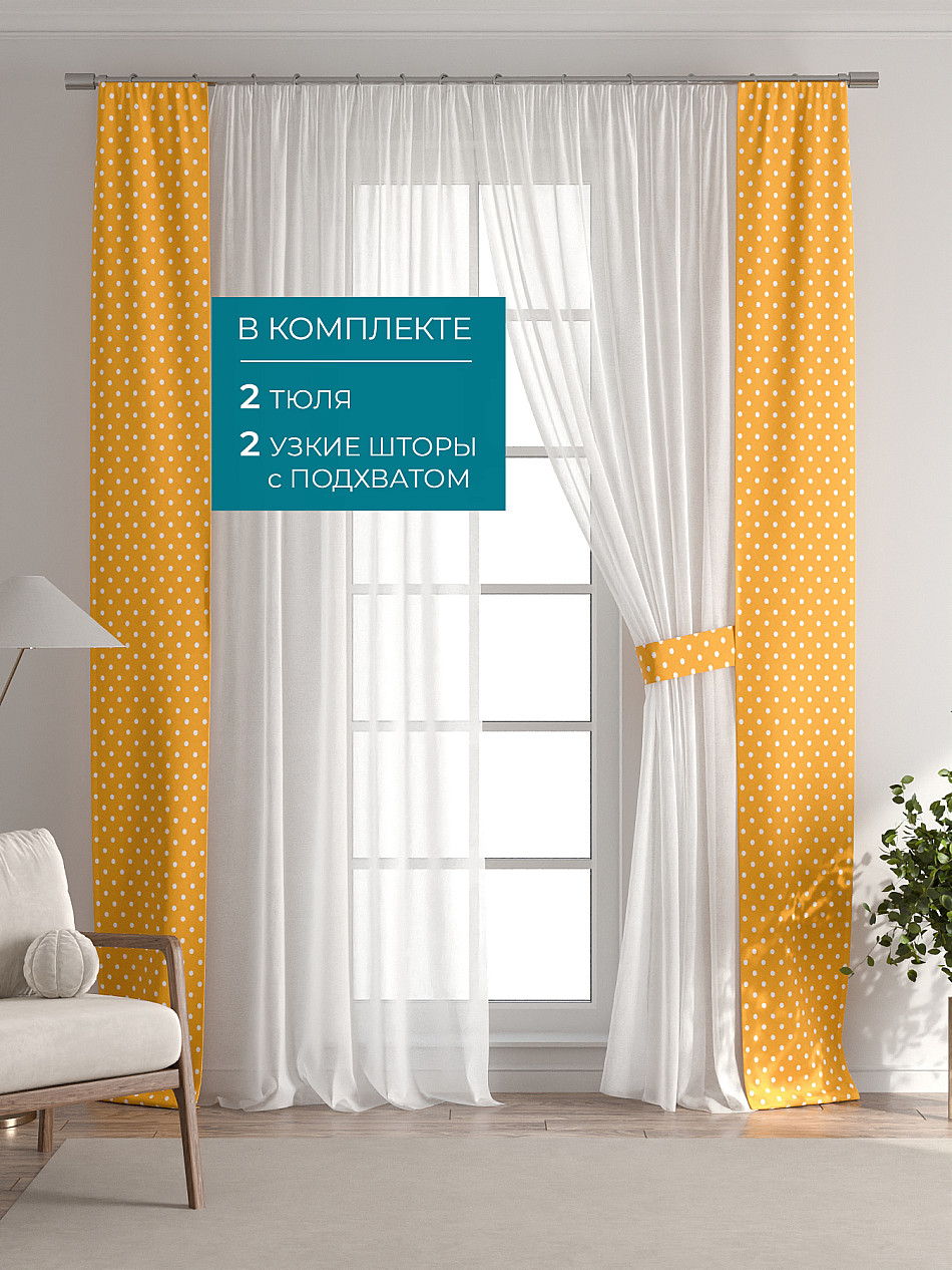 Представляем вам абсолютно новый подход к оформлению окна! Наш комплект белого тюля с узкими цветными шторами-подхватами станет идеальным решением для тех, кто любит, чтобы в комнате было светло и при этом хочет добавить цветовой акцент в интерьер комнаты.