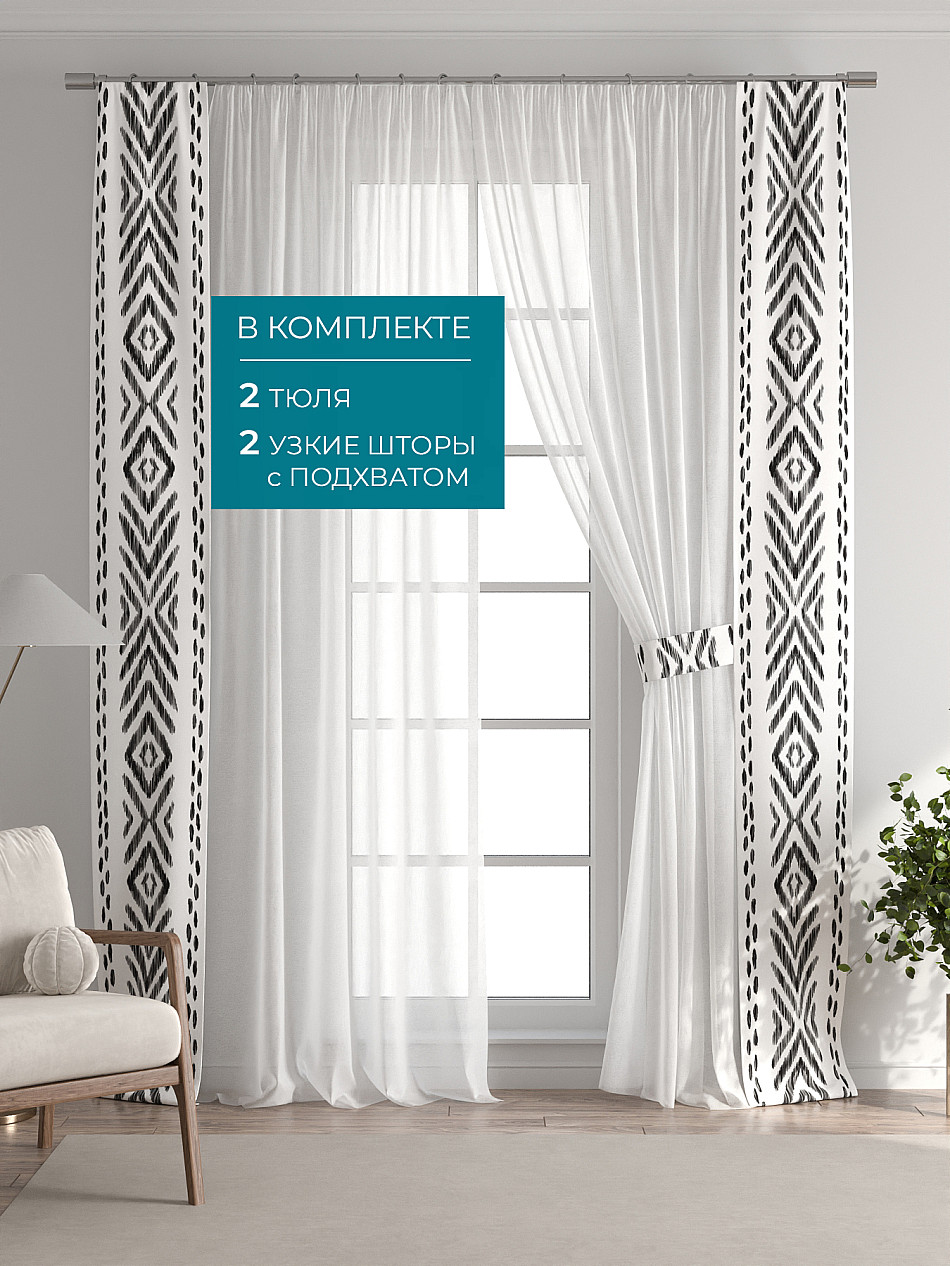 В комплект входят: - 2 полотна белого тюля шириной 150 см.. и высотой 260 см и - 2 узкие шторы шириной всего 38 см. и длиной 260 см., которые навешиваются рядом с тюлем не утяжеляя вид окна и не препятствуя попаданию солнечного света в комнату. При этом выполняют роль подхватов и добавляют акцент в интерьер.