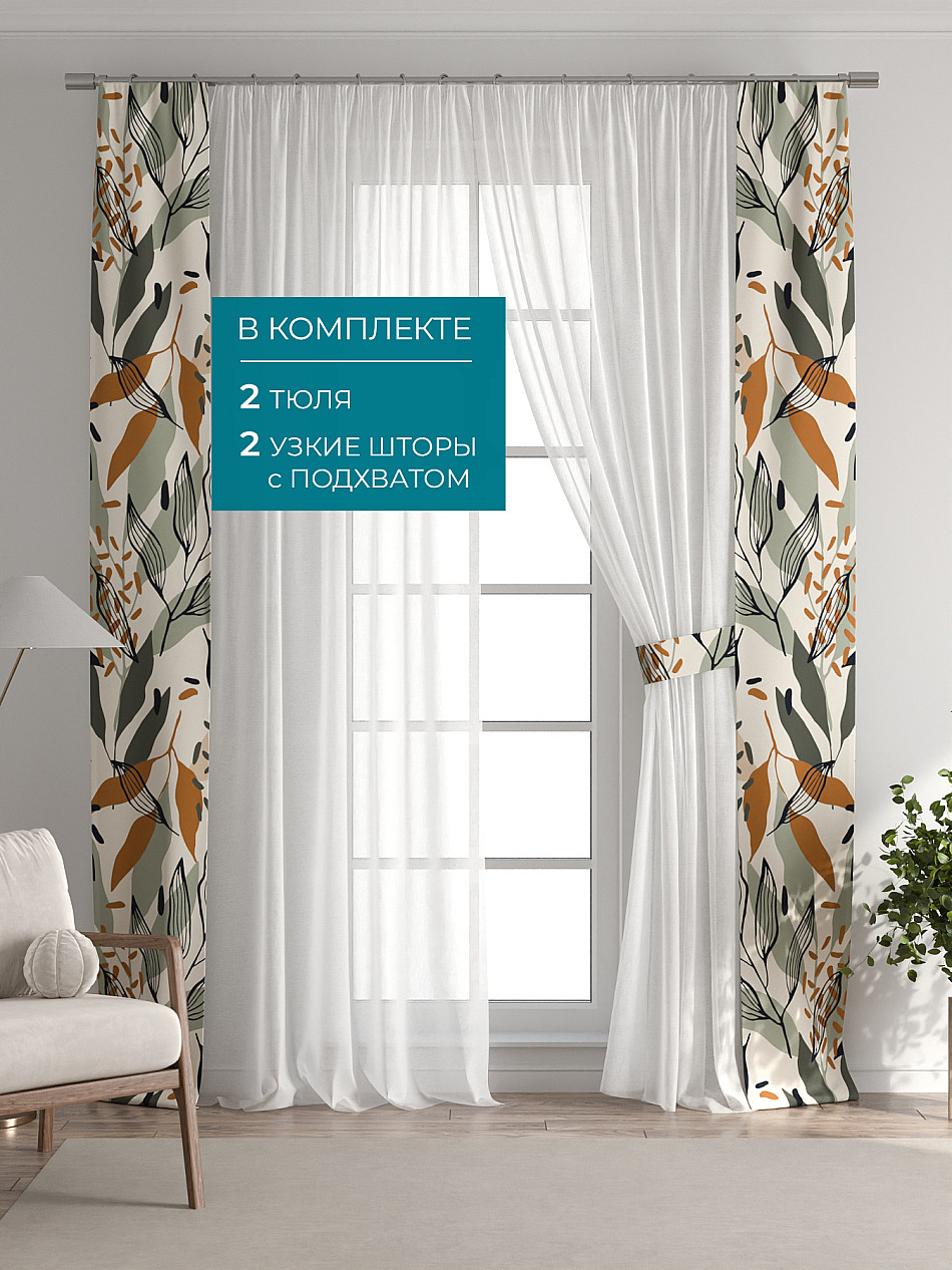 Представляем вам абсолютно новый подход к оформлению окна! Наш комплект белого тюля с узкими цветными шторами-подхватами станет идеальным решением для тех, кто любит, чтобы в комнате было светло и при этом хочет добавить цветовой акцент в интерьер комнаты.