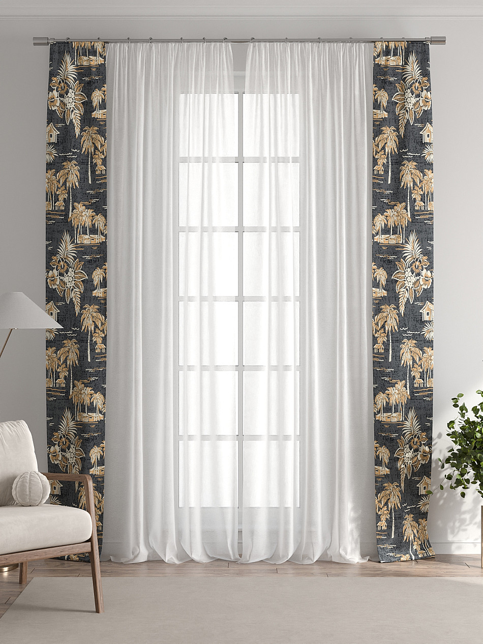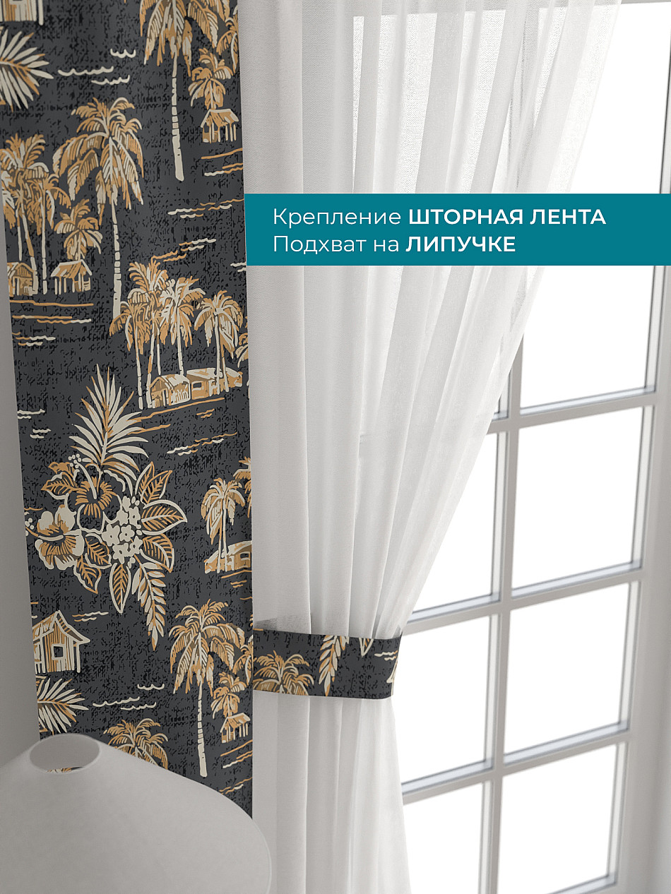 Комплект готов к развешиванию. По верхнему краю пристрочена шторная лента 6 см, с 2-мя рядами петель под крючки, что позволяет регулировать высоту. Одновременно имеется кулиска (карман для штанги), в которую можно продеть карниз любого диаметра.