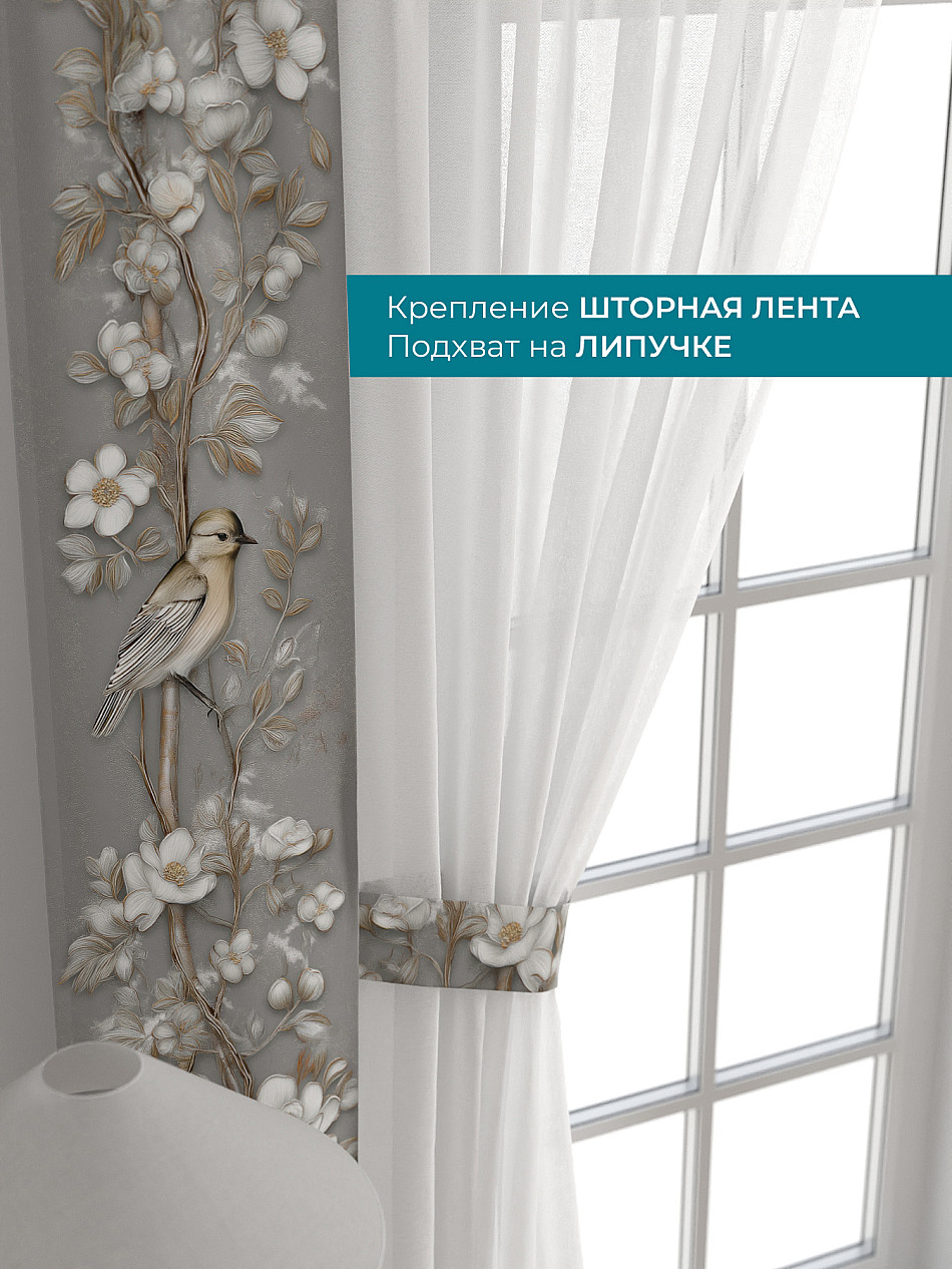 На высоте 125 см. пришит подхват (ширина 10 см.), который позволяет легко зафиксировать тюль или шторы в нужном положении при помощи липучки.