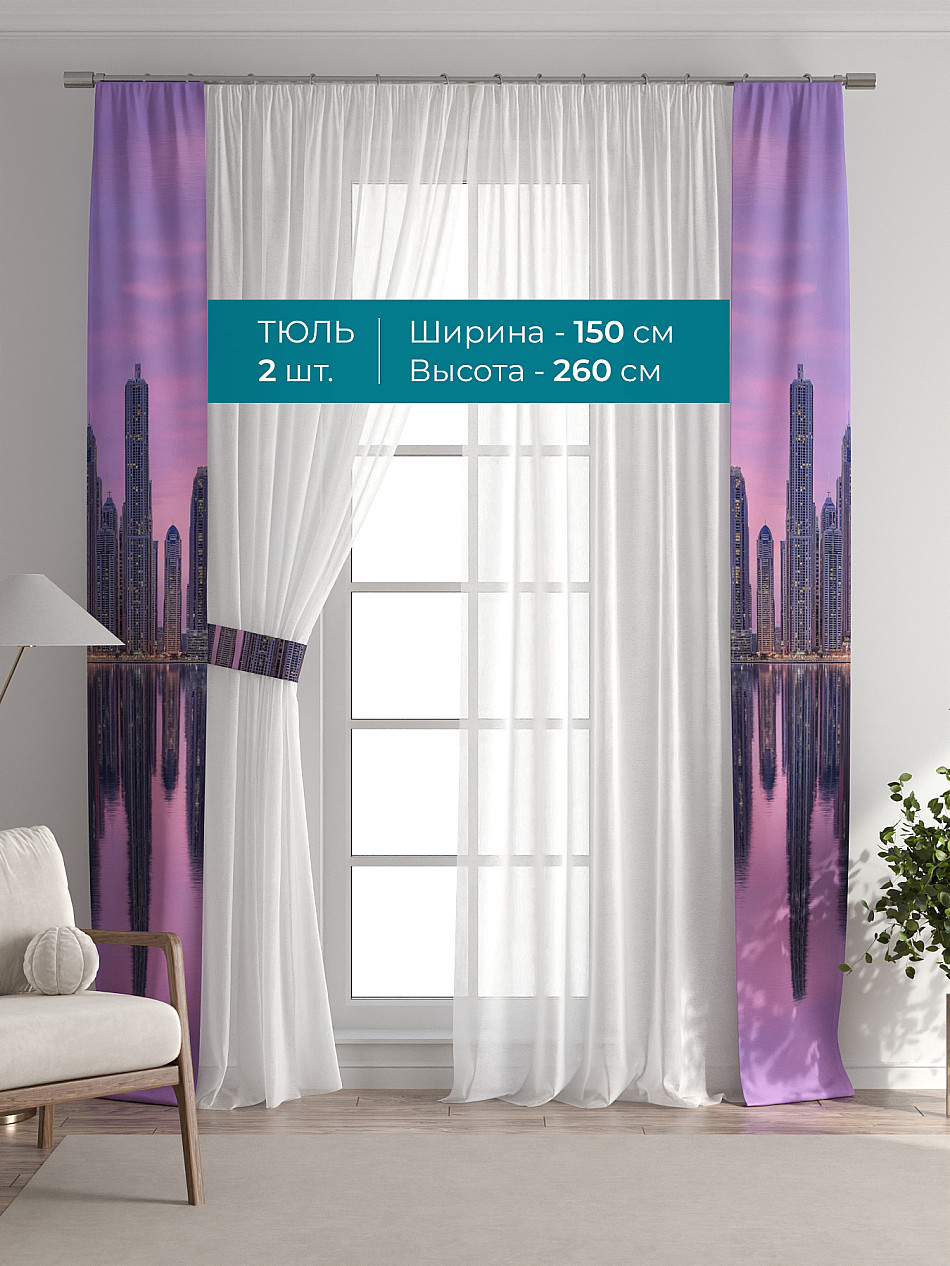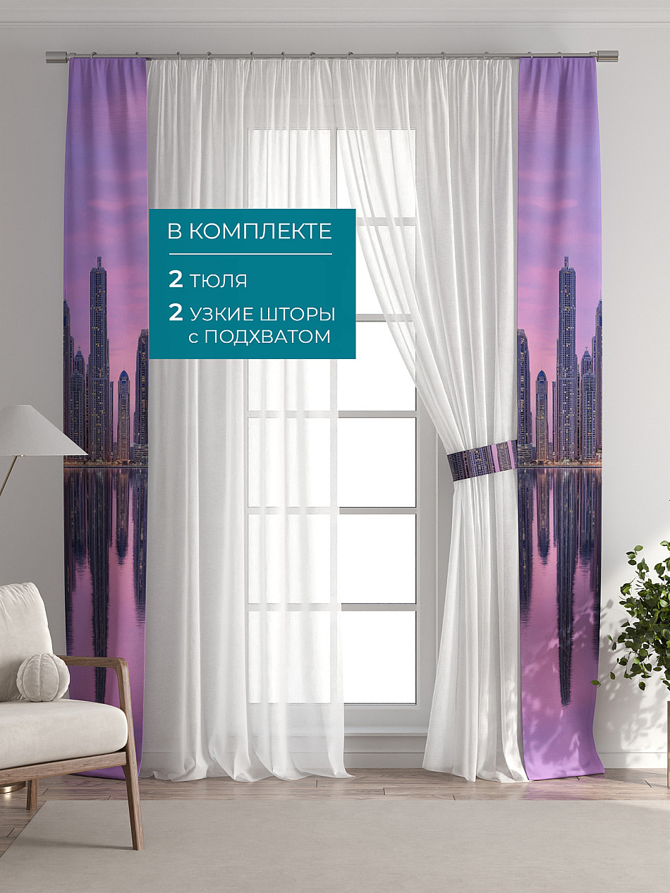 В комплект входят: - 2 полотна белого тюля шириной 150 см.. и высотой 260 см и - 2 узкие шторы шириной всего 38 см. и длиной 260 см., которые навешиваются рядом с тюлем не утяжеляя вид окна и не препятствуя попаданию солнечного света в комнату. При этом выполняют роль подхватов и добавляют акцент в интерьер.
