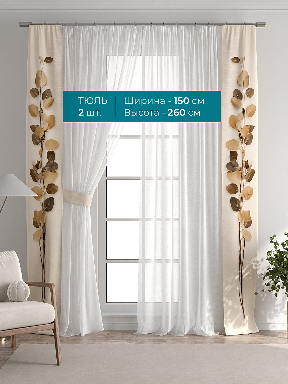 Декоративные подхваты 38х260 см — 2 шт.; Тюль 150х260 см — 2 шт. ( Изменить высоту) Крепление: шторная лента (крючки), кулиска Подробнее