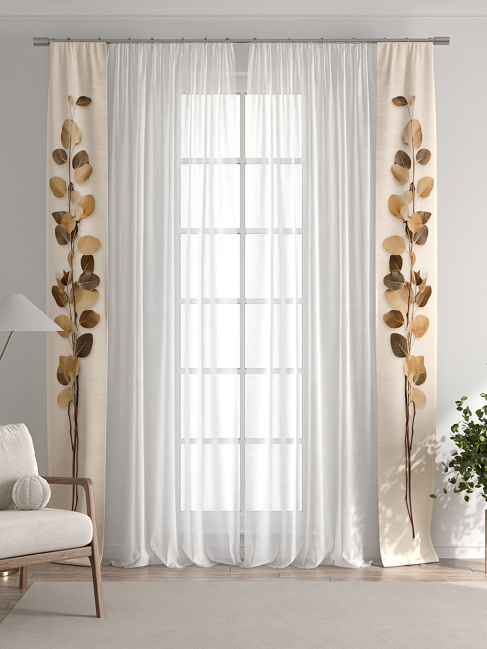 Комплект готов к развешиванию. По верхнему краю пристрочена шторная лента 6 см, с 2-мя рядами петель под крючки, что позволяет регулировать высоту. Одновременно имеется кулиска (карман для штанги), в которую можно продеть карниз любого диаметра.