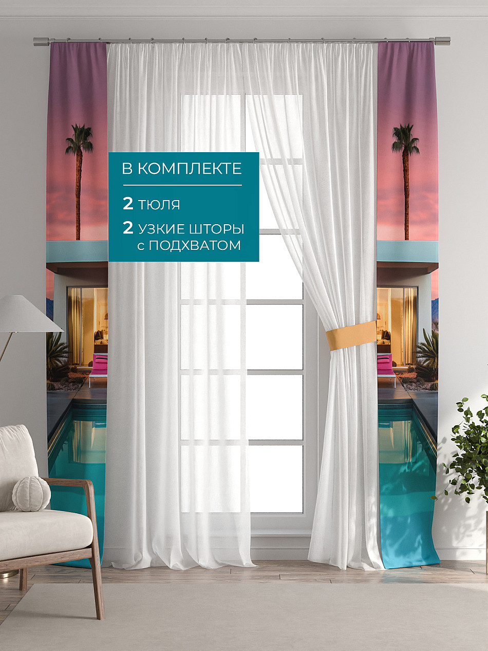 Представляем вам абсолютно новый подход к оформлению окна! Наш комплект белого тюля с узкими цветными шторами-подхватами станет идеальным решением для тех, кто любит, чтобы в комнате было светло и при этом хочет добавить цветовой акцент в интерьер комнаты.