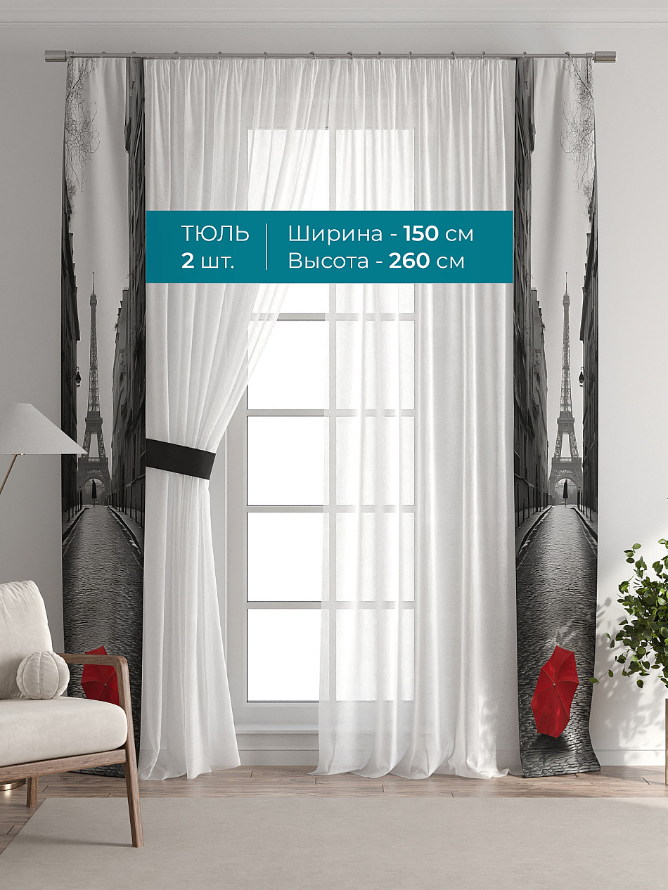 В комплект входят: - 2 полотна белого тюля шириной 150 см.. и высотой 260 см и - 2 узкие шторы шириной всего 38 см. и длиной 260 см., которые навешиваются рядом с тюлем не утяжеляя вид окна и не препятствуя попаданию солнечного света в комнату. При этом выполняют роль подхватов и добавляют акцент в интерьер.
