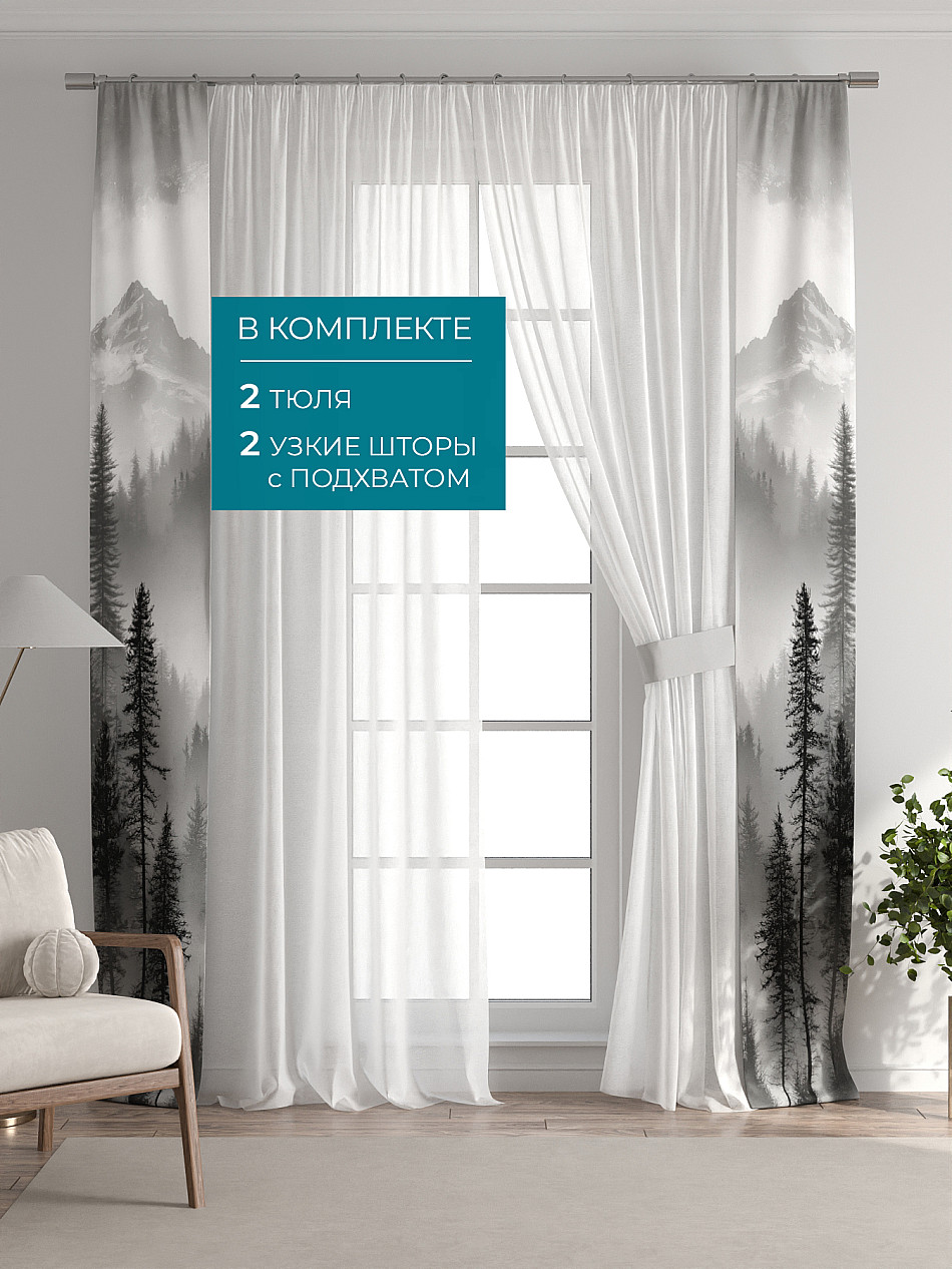 В комплект входят: - 2 полотна белого тюля шириной 150 см.. и высотой 260 см и - 2 узкие шторы шириной всего 38 см. и длиной 260 см., которые навешиваются рядом с тюлем не утяжеляя вид окна и не препятствуя попаданию солнечного света в комнату. При этом выполняют роль подхватов и добавляют акцент в интерьер.