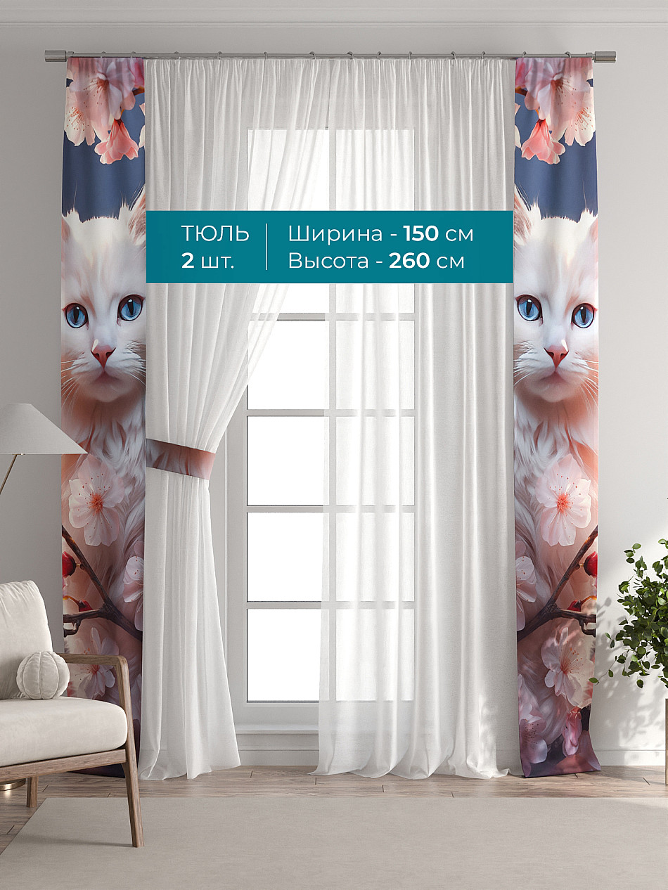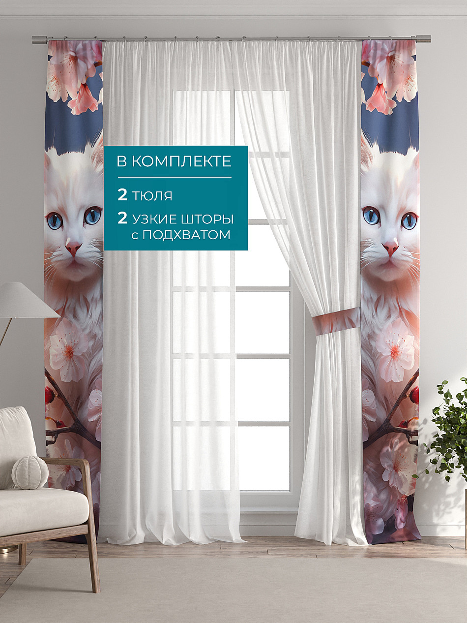 В комплект входят: - 2 полотна белого тюля шириной 150 см.. и высотой 260 см и - 2 узкие шторы шириной всего 38 см. и длиной 260 см., которые навешиваются рядом с тюлем не утяжеляя вид окна и не препятствуя попаданию солнечного света в комнату. При этом выполняют роль подхватов и добавляют акцент в интерьер.
