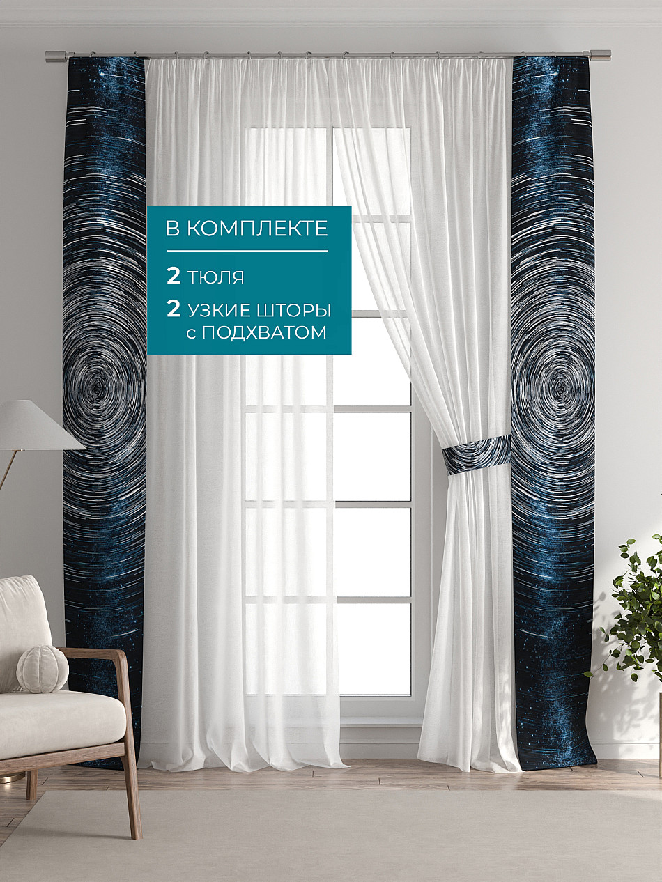 В комплект входят: - 2 полотна белого тюля шириной 150 см.. и высотой 260 см и - 2 узкие шторы шириной всего 38 см. и длиной 260 см., которые навешиваются рядом с тюлем не утяжеляя вид окна и не препятствуя попаданию солнечного света в комнату. При этом выполняют роль подхватов и добавляют акцент в интерьер.