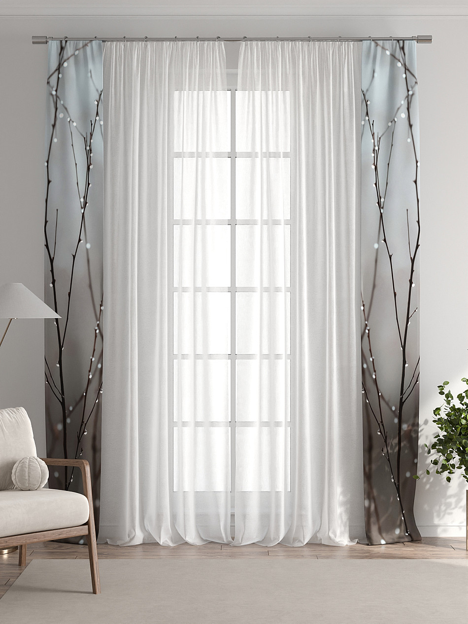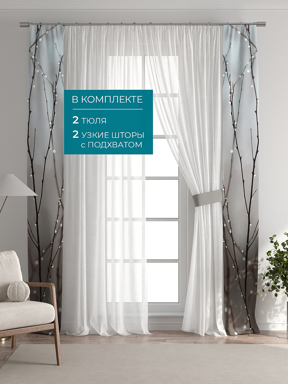 В комплект входят: - 2 полотна белого тюля шириной 150 см.. и высотой 260 см и - 2 узкие шторы шириной всего 38 см. и длиной 260 см., которые навешиваются рядом с тюлем не утяжеляя вид окна и не препятствуя попаданию солнечного света в комнату. При этом выполняют роль подхватов и добавляют акцент в интерьер.