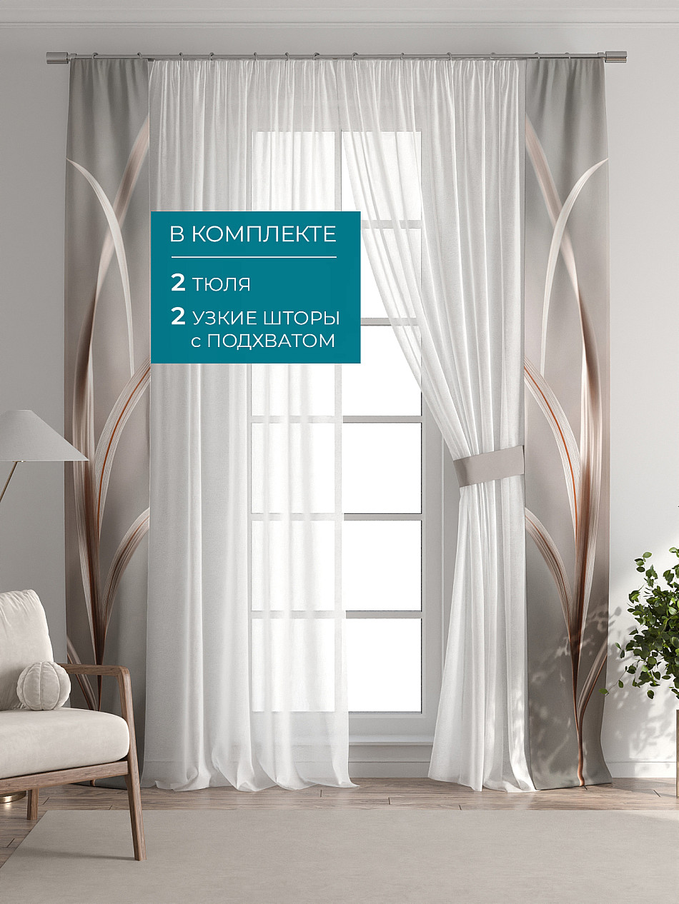 В комплект входят: - 2 полотна белого тюля шириной 150 см.. и высотой 260 см и - 2 узкие шторы шириной всего 38 см. и длиной 260 см., которые навешиваются рядом с тюлем не утяжеляя вид окна и не препятствуя попаданию солнечного света в комнату. При этом выполняют роль подхватов и добавляют акцент в интерьер.