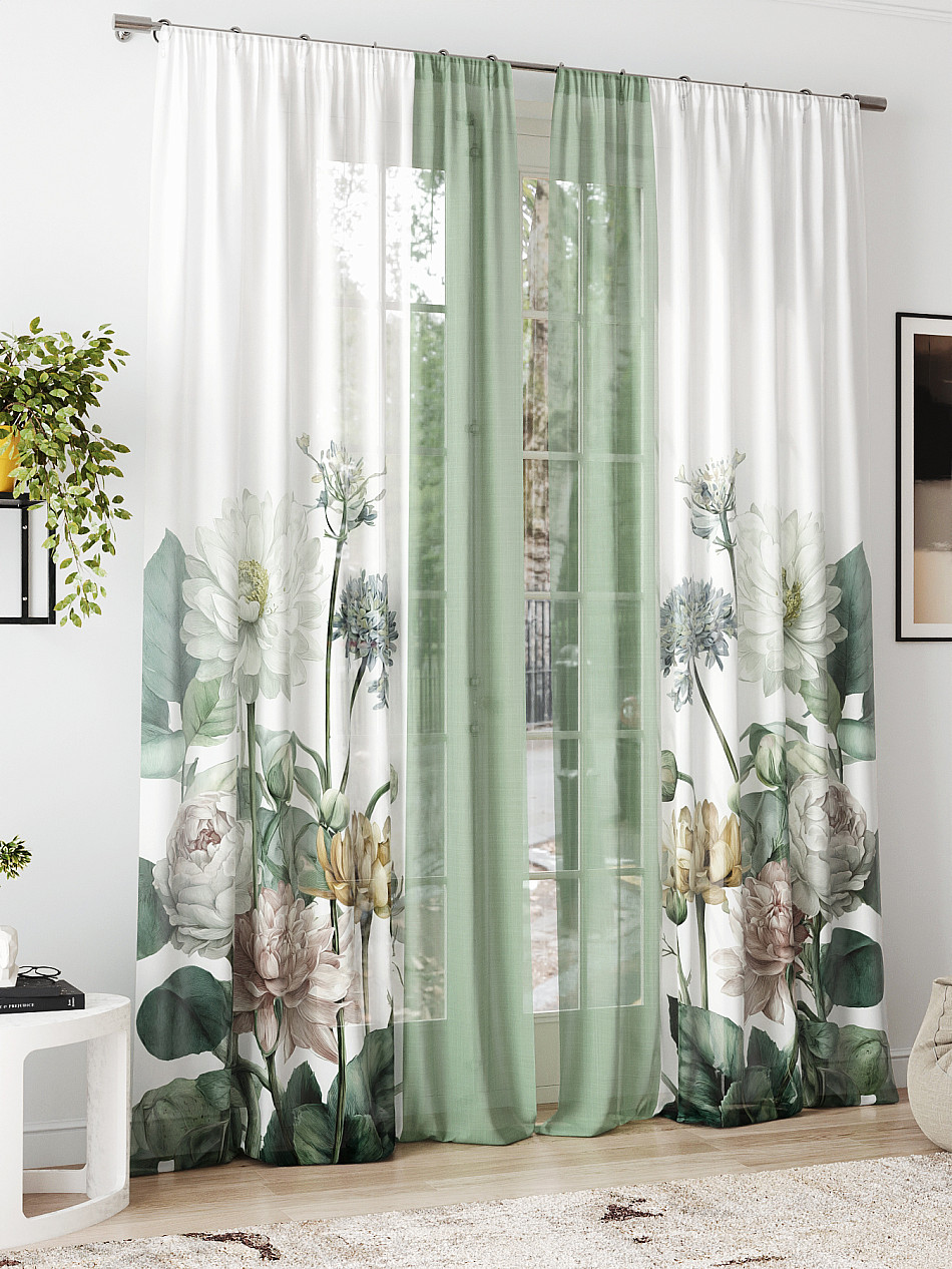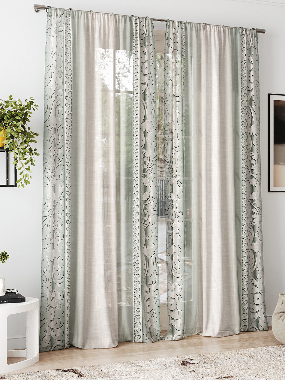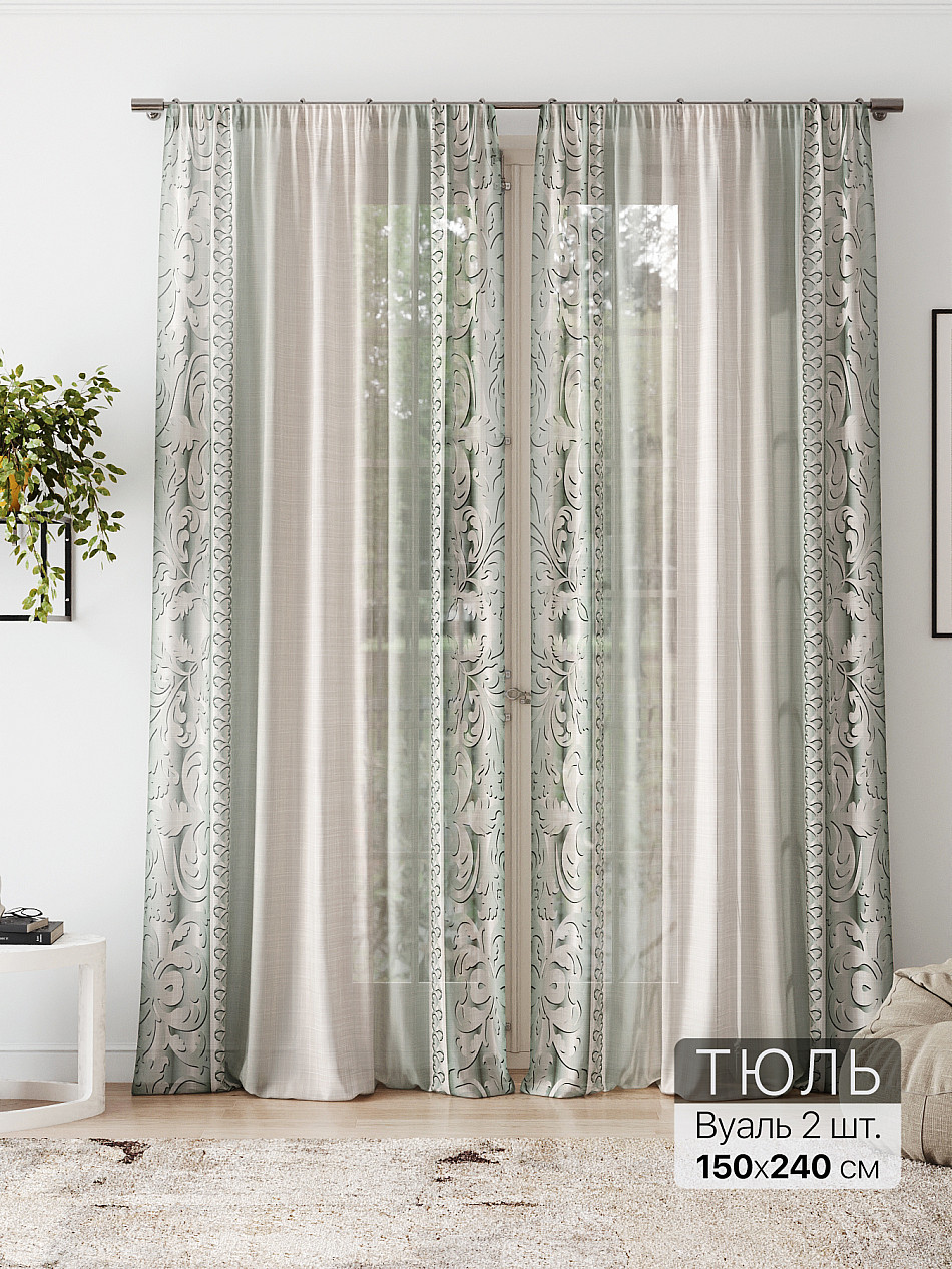 очень красивый тюль, в натуральном виде зеленый цвет более нежный, сама штора белоснежная. пошив очень аккуратный, шторная лента плотная. покупкой довольна -