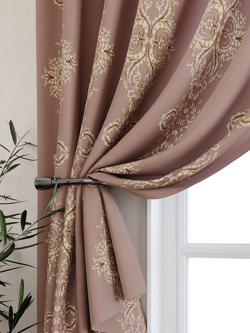 Штора по факту серая серебристая с золотистым рисунком. По бокам полосы приглушенного розового пудрового оттенка с рисунком. Смотрится отлично.размеры соответствуют заявленным. Мне штора понравилась. -