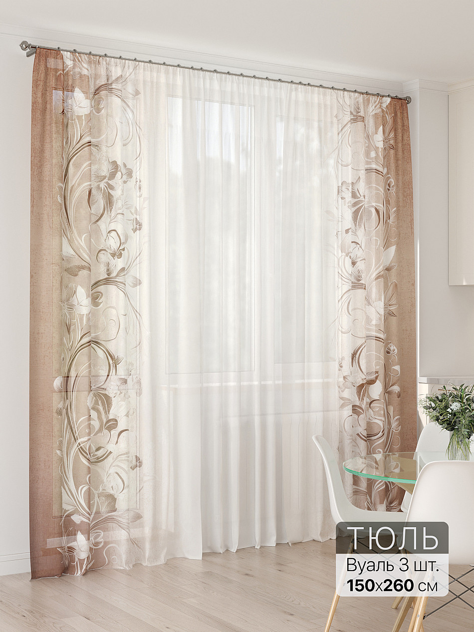Разнообразие полупрозрачных тканей позволяет подобрать ткань, которая будет гармонично смотреться в любом интерьере будь то классический или современный стиль. Тюли бежевого цвета выполняют из вуали, органзы, шифона, сетки, батиста и льна. Для украшения материала используют объемную вышивку, геометрические и цветочные рисунки, фотопечать.