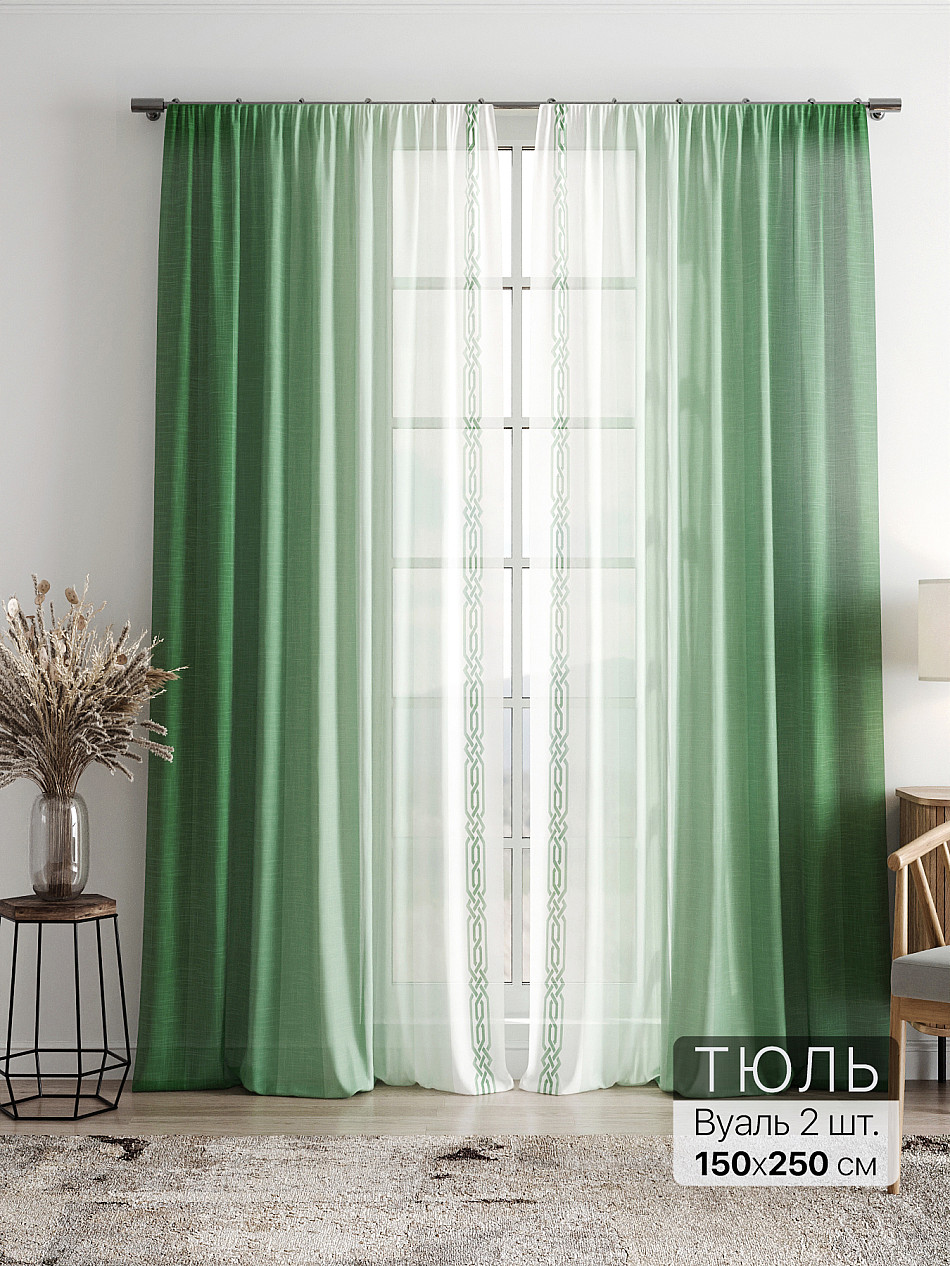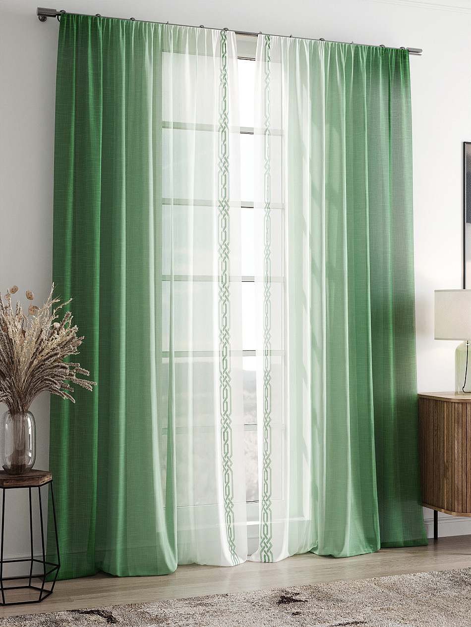 очень красивый тюль, в натуральном виде зеленый цвет более нежный, сама штора белоснежная. пошив очень аккуратный, шторная лента плотная. покупкой довольна