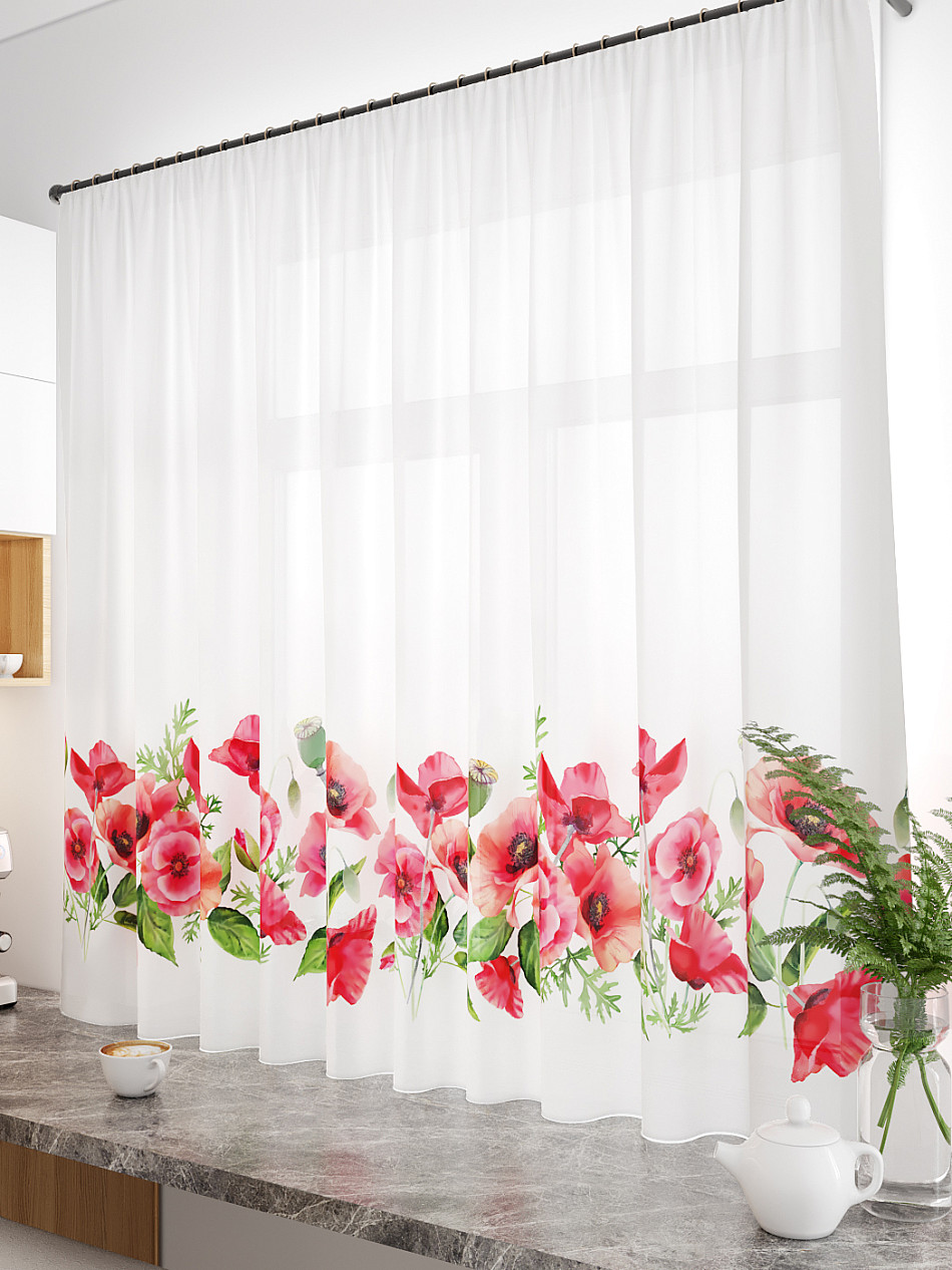 Предпочитаете мебель из натурального дерева в классическом или деревенском стиле? Купите тюль и шторы на кухню с цветочным орнаментом. Он дополнит подобный интерьер. Растительный узор станет украшением кухни или столовой загородного дома.